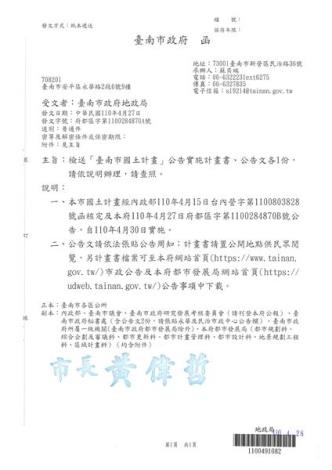 公告實施「臺南市國土計畫」,自民國110年4月30日起生效
