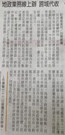 地政局說,為減少跨區域的移動,民眾如有申辦土地登記之需求,除線上申請外,得就近向全國任一地政事務所申請,便利、安全又省時。另外亦有「跨縣市代收代寄」服務,由受理代收的地政事務所代為寄送至土地所在地之地政事務所辦理,省去交通往返及花費,民眾都可以在臨近的地政事務所申請代收案件,並於登記完畢後可申請直接郵寄到家,同樣省時又便利。