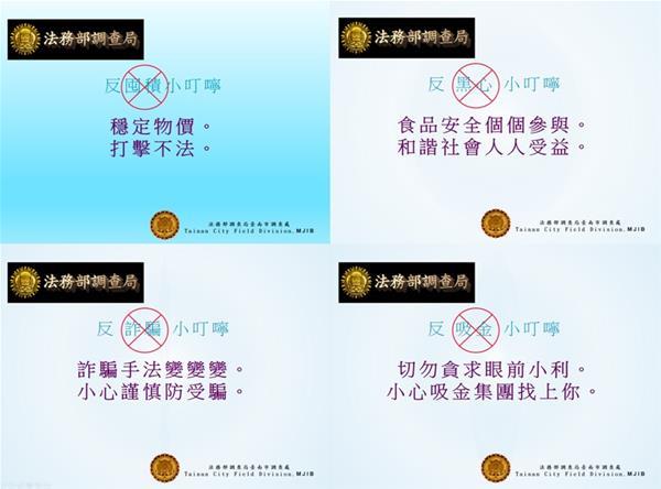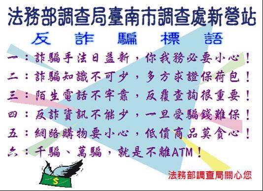 一:詐騙手法日益新,你我務必要小心! 二:詐騙知識不可少,多方求證保荷包! 三:陌生電話不牢靠,反覆查詢很重要! 四:反詐資訊不能少,一旦受騙錢難保! 五:網路購物要小心,低價商品莫貪心! 六:千騙、萬騙,就是不離ATM! 法務部調查局關心您